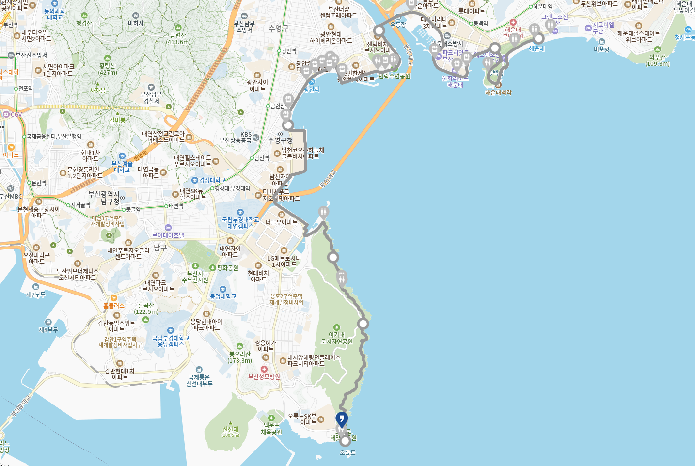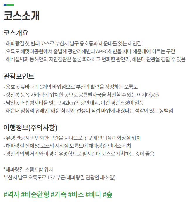 해운대 종합관광봉사센터 - 민락수변공원 - 남천해변공원 - 이기대 동생말 전망대 - 오륙도 해맞이 공원📌 무리 없는 해안 산책 코스 | |