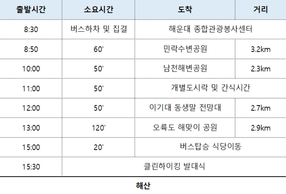 오륙도 해맞이공원에서 출발해 이기대 해안선을 따라 이어지는 이 길은 탁 트인 수평선, 절벽 아래로 부서지는 파도 소리, 천천히 이어지는 해안 산책로. 그 아름다움 속에 우리는 잠시 멈춰서 바닥을 바라봅니다. 그리고 아주 작은 행동 하나를 합니다. 손을 뻗어, 바다 옆에 남겨진 흔적을 줍는 일 동해가 시작되는 곳. 푸른 바다와 가장 먼저 인사를 나누는 길. 하지만 우리는 여기에 조금 더 의미 있는 발걸음을 더해보려 합니다. | |