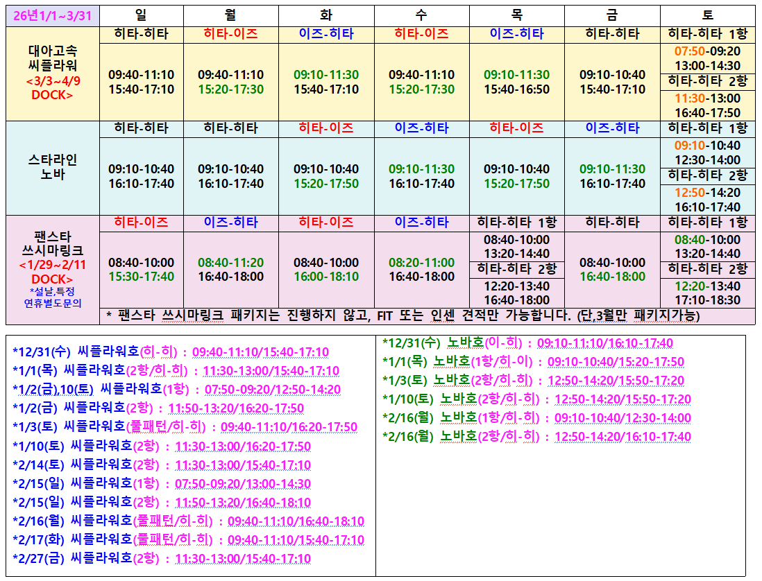 - 연휴 기간에는 운항 스케줄이 기존일정과 상이할 수 있으므로 재확인 부탁드립니다.
