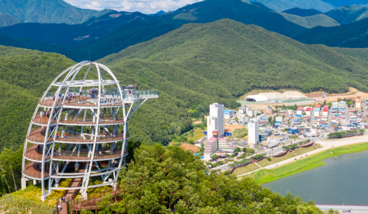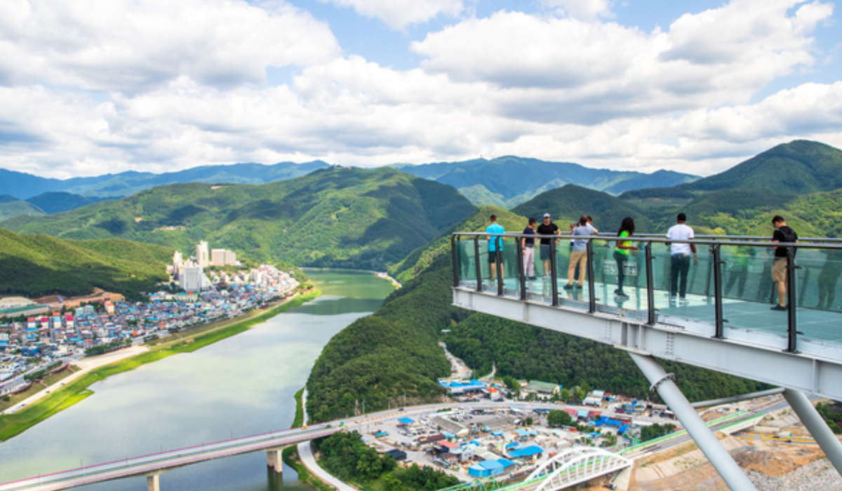| ๋จ์๊ตฐ ์ ์ฑ๋ฉด์ ์์นํ ๋ง์ฒํ์ค์นด์ด์ํฌ์์๋ ๋จํ๊ฐ ์ ๋ฒฝ ์์์ 80~90m ์๋ฉด ์๋๋ฅผ ๋ด๋ ค๋ณด๋ฉฐ ํ๋๊ธธ์ ๊ฑท๋ ์ค๋ฆด์ ๋ง๋ณผ ์ ์๋ค. ์ ๋ง๋๋ก ๊ฐ๋ ๋์ ํ ๊ตฌ๊ฐ์์๋ ๋ค๊ฐ๋๋ก ํ๊ด์ ๊ฐ์ํ ์ ์๊ณ , ์ ๋ง๋์ ์๋ฉด ์ฐ๋ฑ์ฑ์ด ๋๋จธ ๋๋๊ฒ ํ๋ฅด๋ ๋จํ๊ฐ ๊ฒฝ์น์ ๊ฐํ์ฌ๊ฐ ์ ๋ก ๋์จ๋ค. ์ ๋ง๋์ ์ฌ๋ผ์๋ฉด ์๋ด ์ ๊ฒฝ๊ณผ ๋ฉ๋ฆฌ ์๋ฐฑ์ฐ ์ฐํ๋ด์ ๋ณผ ์ ์๋ค. ๋ง๊ตฝํ์ ๋งํ์ฒ๋ด ์ ๋ง๋์ ์ธ ์๊ฐ๋ฝ ํํ์ ๊ธธ์ด 15m, ํญ 2m์ ๊ณ ๊ฐ๋ ์ผ์ค ์ ๋ฆฌ๋ฅผ ํตํด ๋ฐ๋ฐ์ ํ๋ฅด๋ ๋จํ๊ฐ์ ๋ด๋ ค๋ค๋ณด๋ฉฐ ์ ๋ฒฝ ๋์์ ๊ฑท๋ ์ง๋ฆฟํจ์ ๊ฒฝํํด ๋ณผ ์ ์๋ค. |
