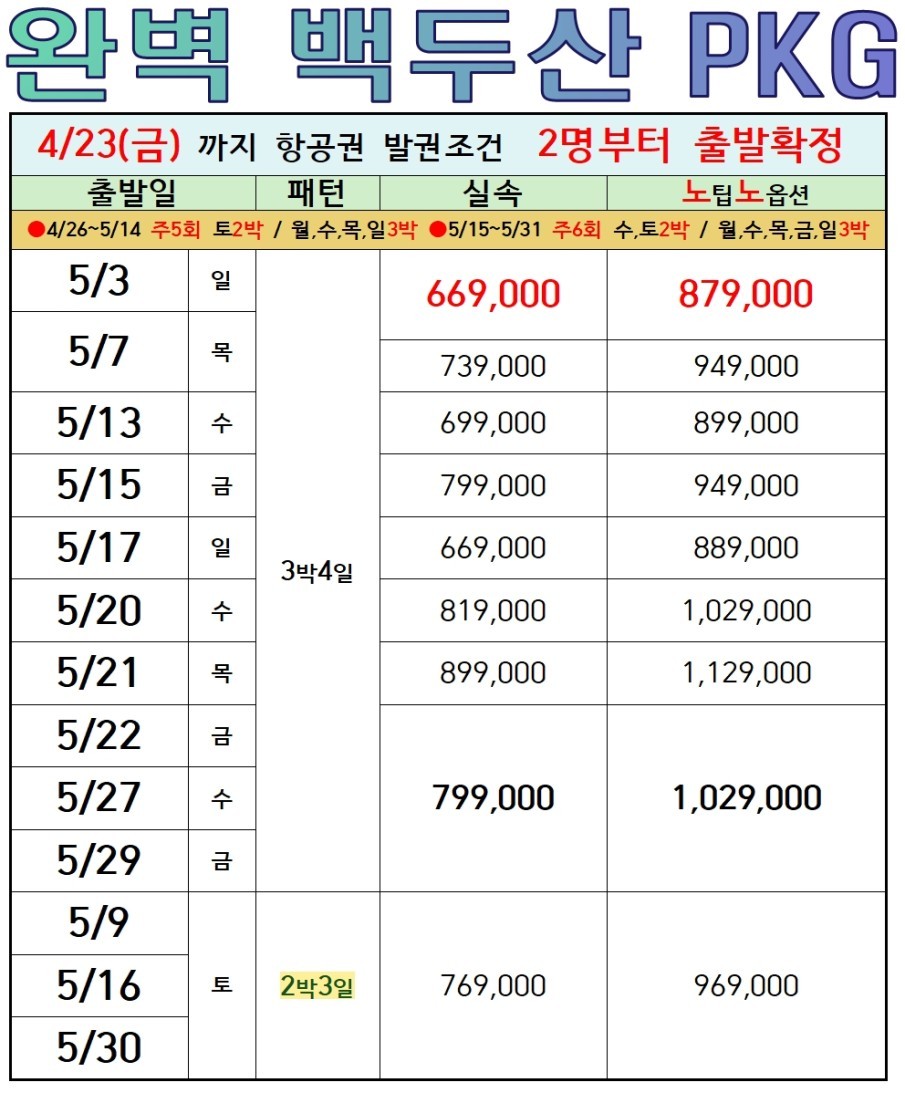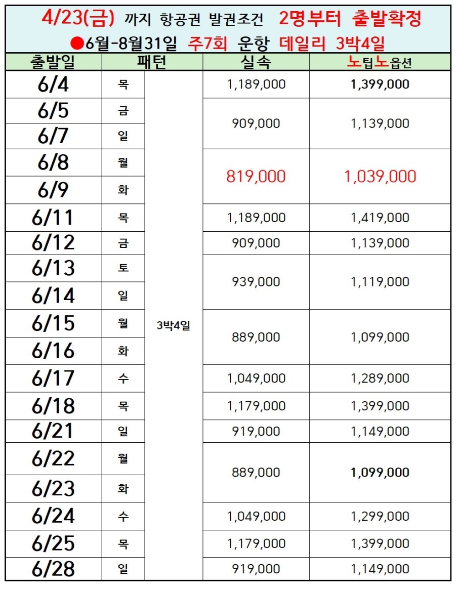 | 출발요일 | * 4/26~5/14 주 5회 * 5/15~5/31 주 6회 * 6월~ 매일 운항 (3박4일) | |