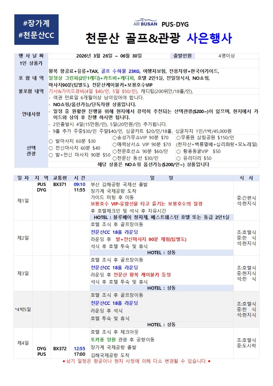 | ์ถ๋ฐ์์ผ | 4/1~5/11 ๋งค์ผ 5/12~5/31 ํ ,์ผ,์ 6/1~6/15 ํ ,์ผ,์ 6/16~6/30 ํ ,์ผ,์ | 5/12~5/31 ํ,์,๋ชฉ 6/1~6/30 ํ,์,๋ชฉ |