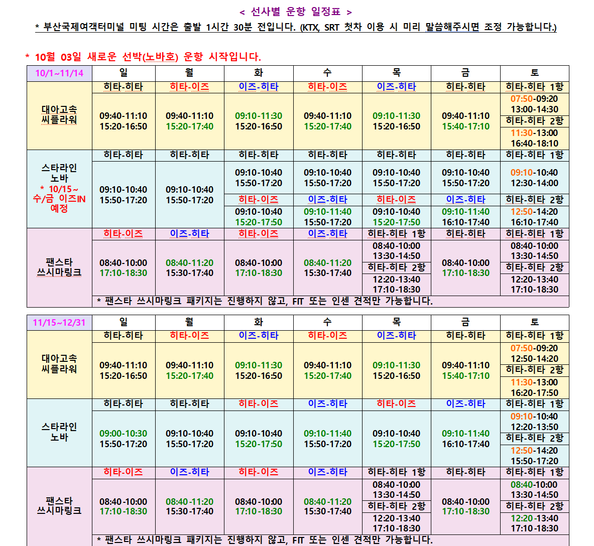 - 연휴 기간에는 운항 스케줄이 기존일정과 상이할 수 있으므로 재확인 부탁드립니다.