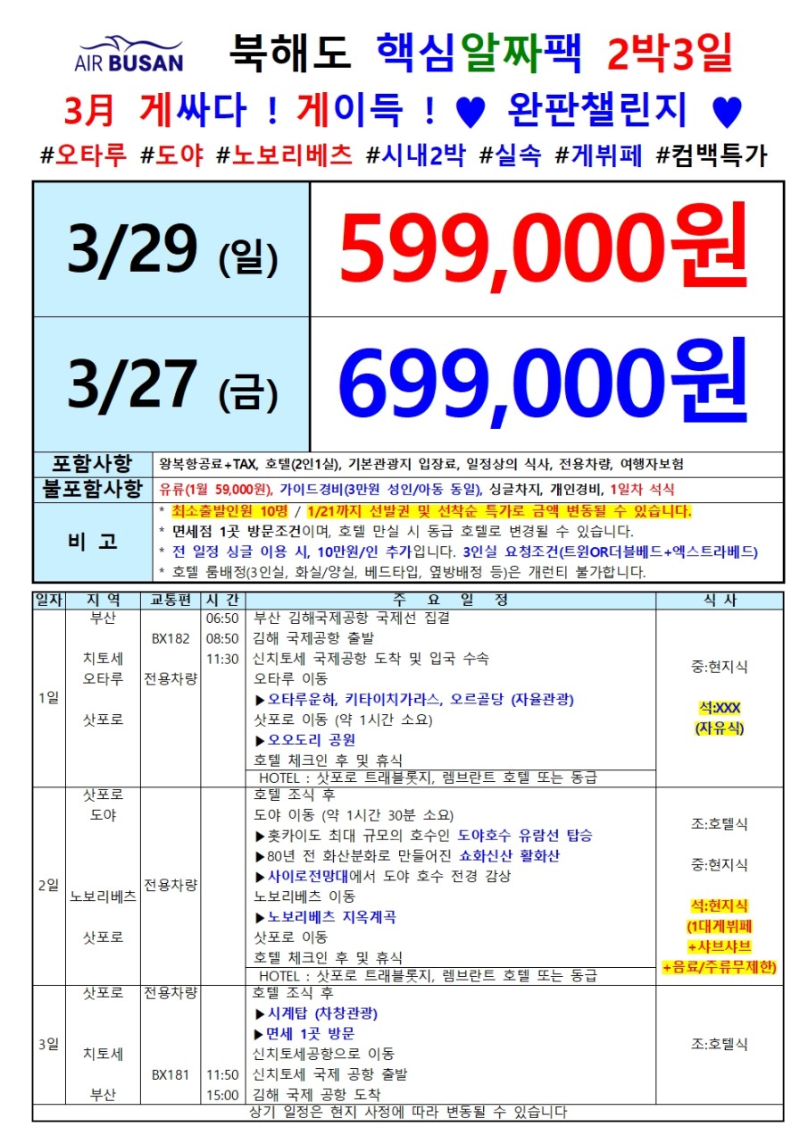 [부산출발] 북해도 2박3일 🎉599 초특가🎉